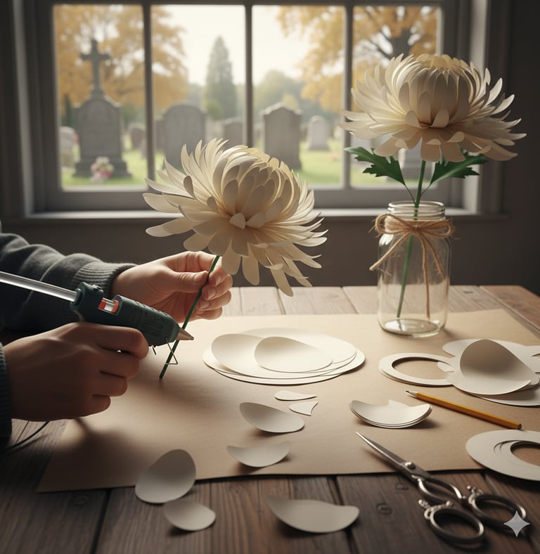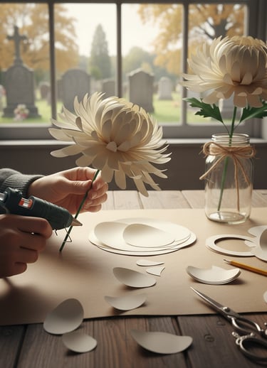 Para quem quer "criar" a flor do zero, as flores de papel são uma alternativa duradoura e muito pessoal. Elas resistem ao sol e à chuva no cemitério, mantendo a homenagem bonita por mais tempo.